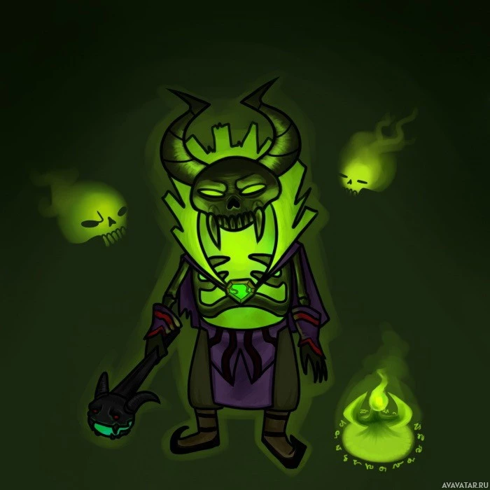 a cartoon character depicted as Pugna from Dota 2. The character is standing in what appears to be a dark or spooky environment, with green