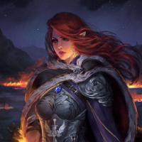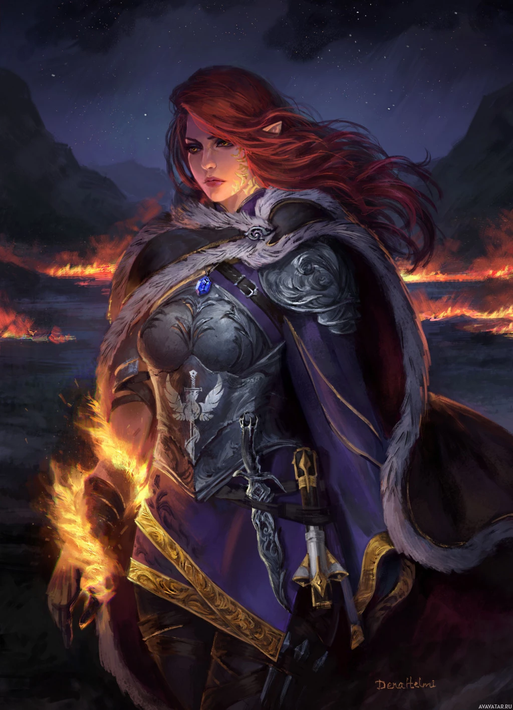 red hair, depicted in a fantasy setting. She is dressed in armor and wearing what seems to be a cape or cloak with