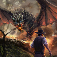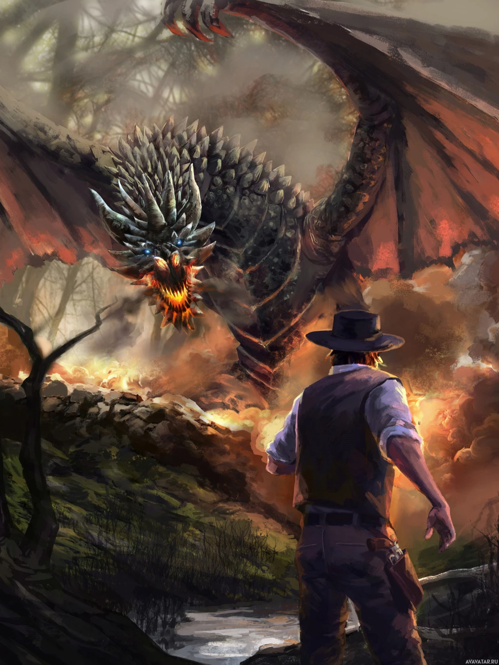 a rugged outfit with a hat, standing and facing towards the viewer. To his right, there is a massive dragon that occupies most of the frame, showcasing its powerful stature and