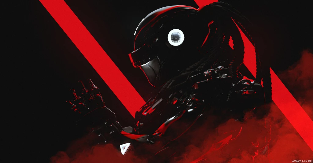 a dark background with red and black accents. The character is wearing a full-body suit that looks like it's designed for a harsh environment such as