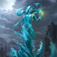 a stormy sky, with buildings partially submerged by water, indicating that she might be emerging from or interacting with a flooded city or coastline. The image is rich in detail and color, emphasizing the mystical and otherworldly