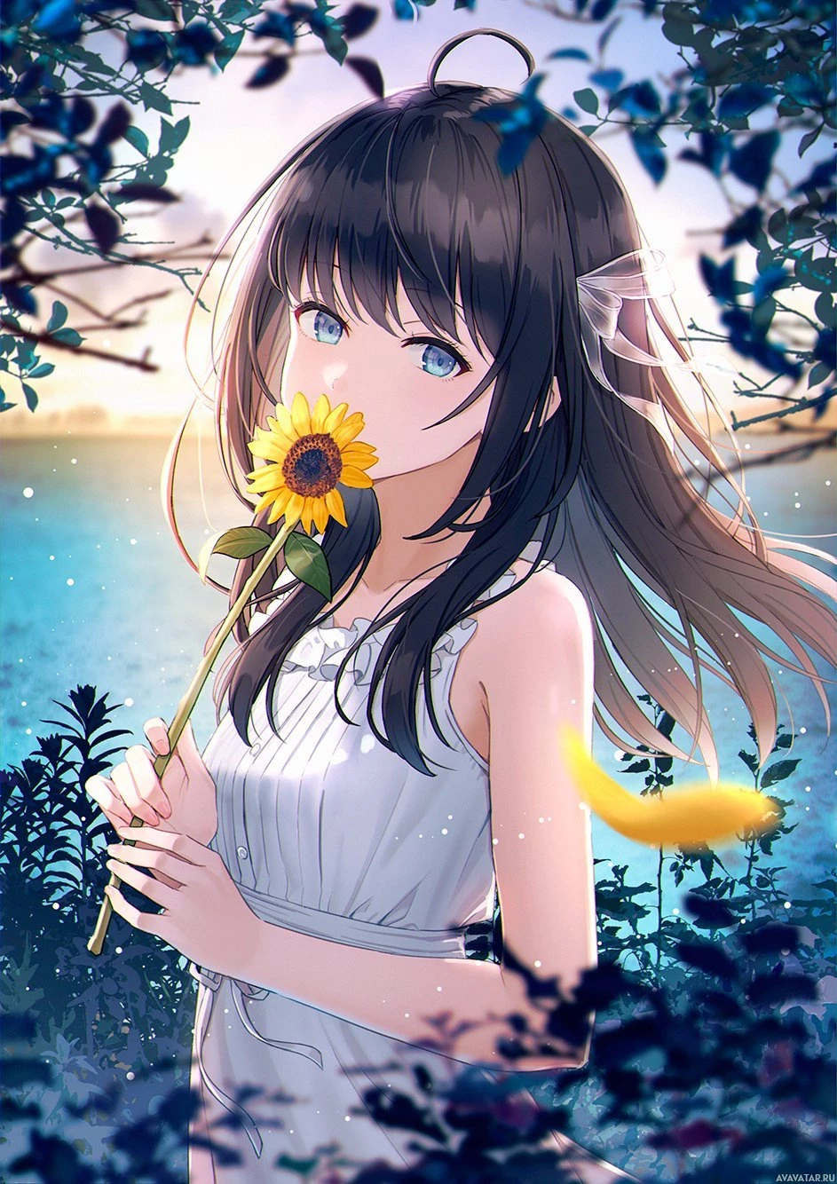 an anime character. She is holding a flower, specifically a sunflower, and seems to be in a serene,
