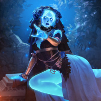 a throne with a skull at the bottom and is surrounded by candles, which adds a mysterious or ominous ambiance. The character is dressed in
