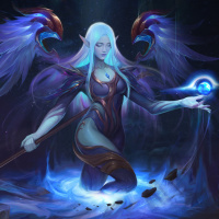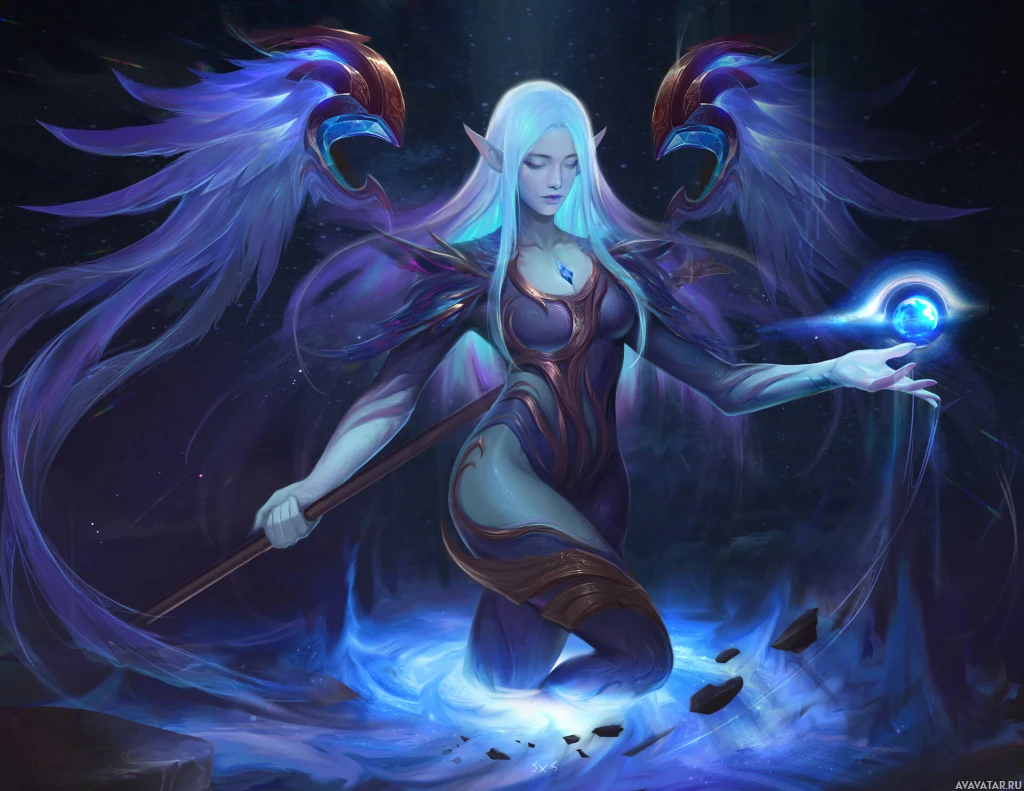 a fantasy character with white hair and closed eyes, which might suggest an angelic or otherworldly presence. This character is depicted in three