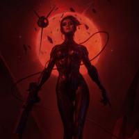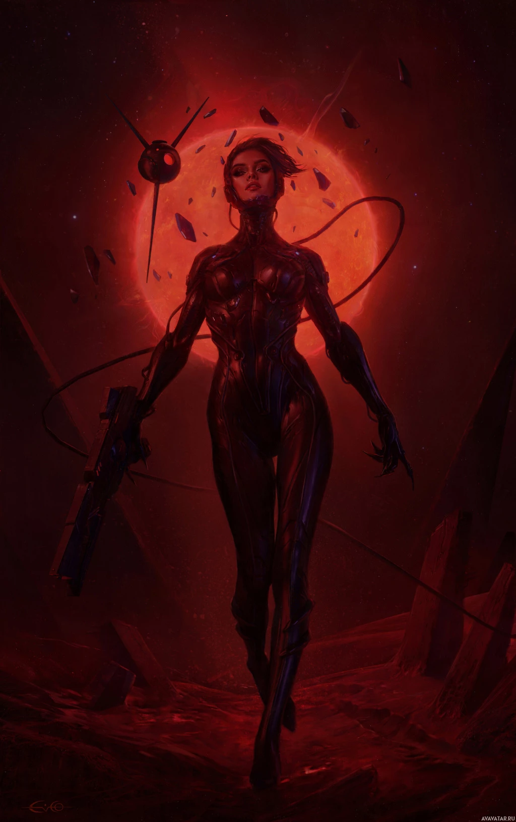 advanced technology or cybernetic enhancements. The character is standing on an alien landscape with