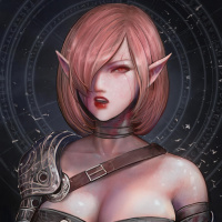 red hair and pointed ears, indicating she is likely an elf. She is wearing armor and is holding what looks like a staff or wand in her left hand. The background suggests a magical or mystical environment, possibly a place where magic is practiced or encountered. The overall style of the artwork suggests it could be from