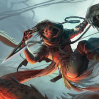 a fantasy scene featuring a male character holding a sword. He is hooded and appears to be facing downward, possibly towards a creature or a group of creatures with