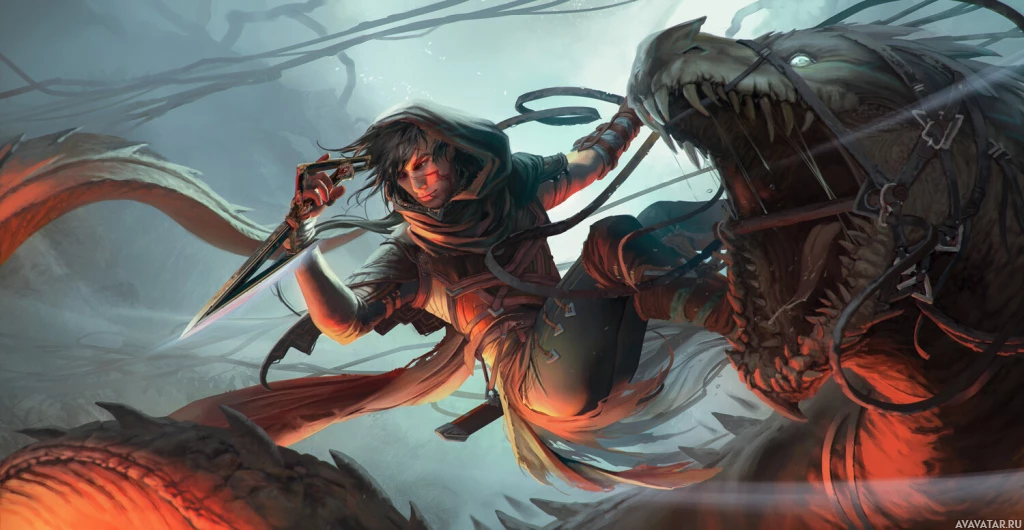 an underground cavern. The artwork has a dramatic and intense atmosphere, fitting the description of fantasy elements present in the image.