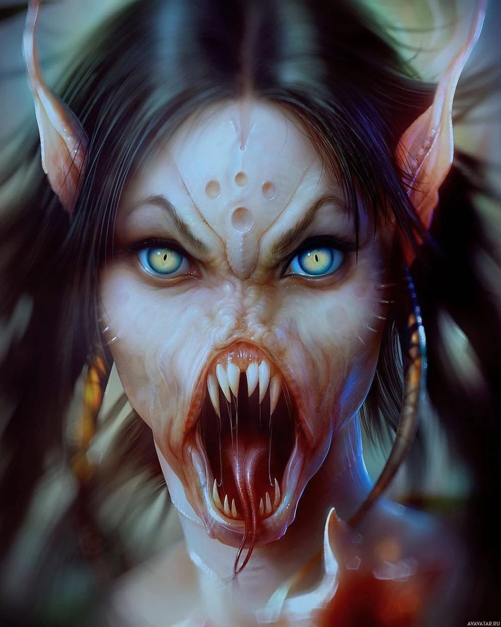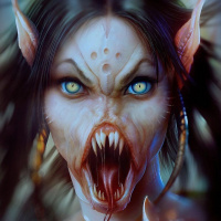 The image depicts a fantasy or horror-themed character. This creature appears to be a female with human features but also has animalistic elements, such as ears and possibly fur, suggesting she is not entirely human. Her expression is intense and somewhat menacing, which contributes to the darker atmosphere of the image. The artwork is highly detailed and vivid, evoking