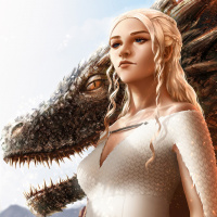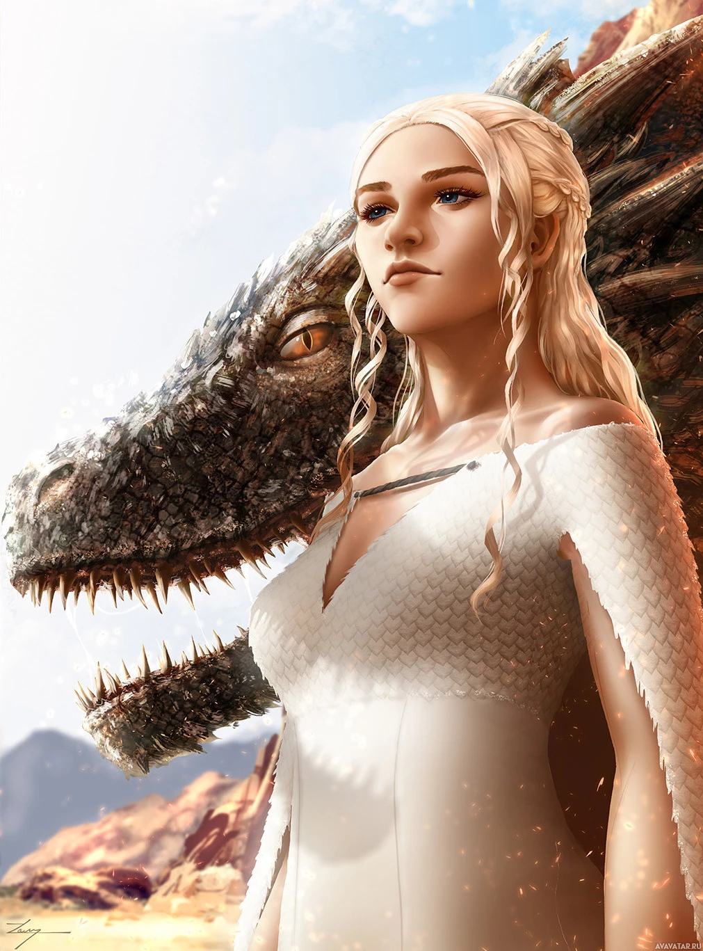 a large dragon, which is another iconic symbol associated with her character. This is an illustration rather than a photograph and showcases Daenerys' strength and connection to