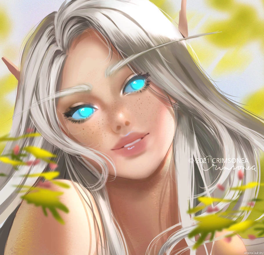 white hair and blue eyes, depicted in a fantasy context. She is seated among what appears to be wildflowers or plants, which suggests a peaceful