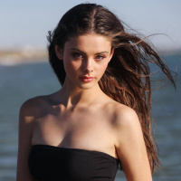 long hair, is wearing a black bikini top, and appears to be barefoot in the shallow water of the ocean. The background suggests it's