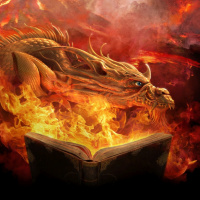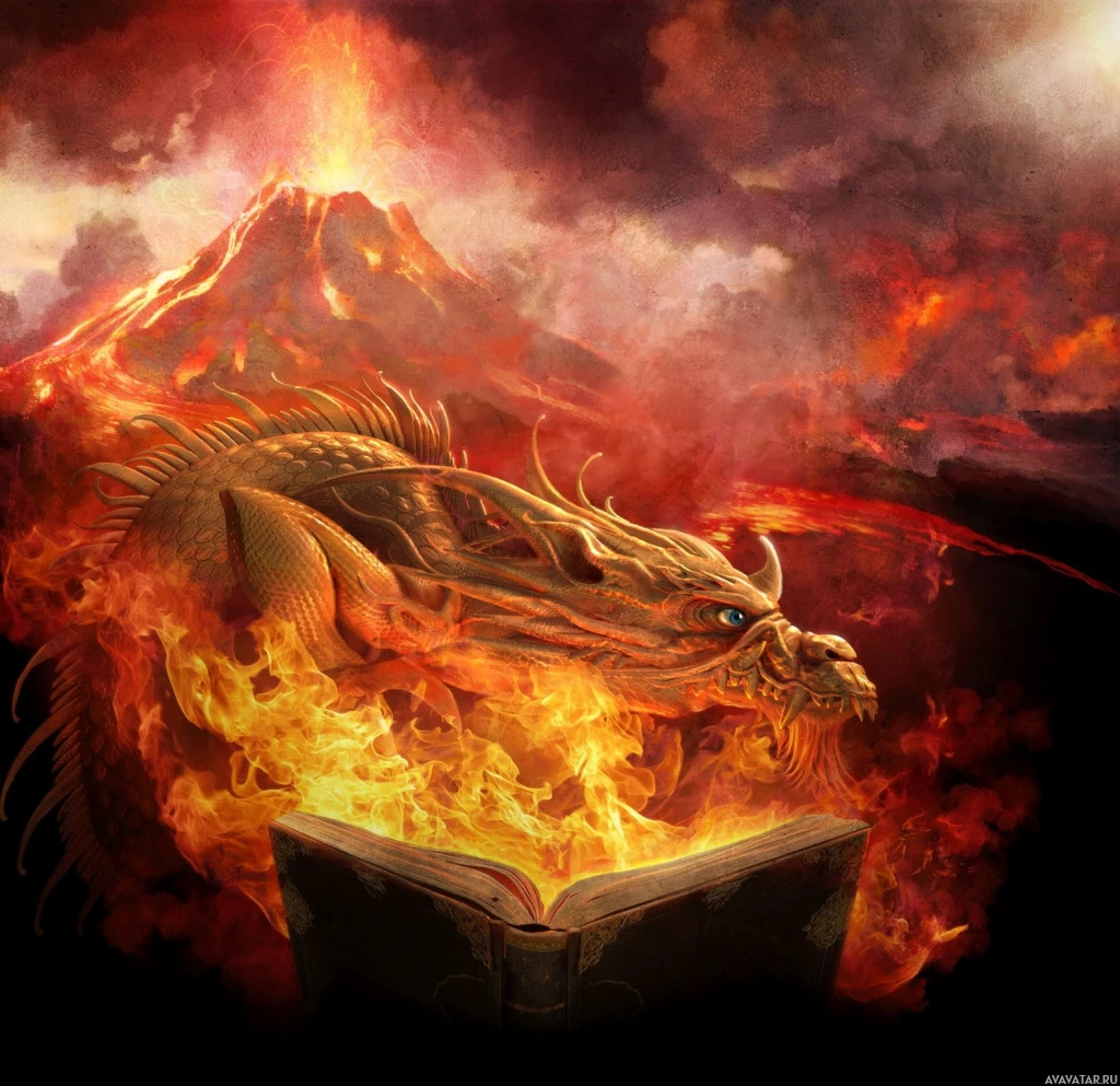 an intense battle or confrontation. The dragon's head is visible above what seems to be a book that it is holding open with its claws, as if revealing knowledge within or igniting fire from its pages. The background includes a volcano or mountain erupting, further emphasizing the dramatic and fiery atmosphere of the scene. The overall impression is one of intense power and possibly the revelation of hidden knowledge or