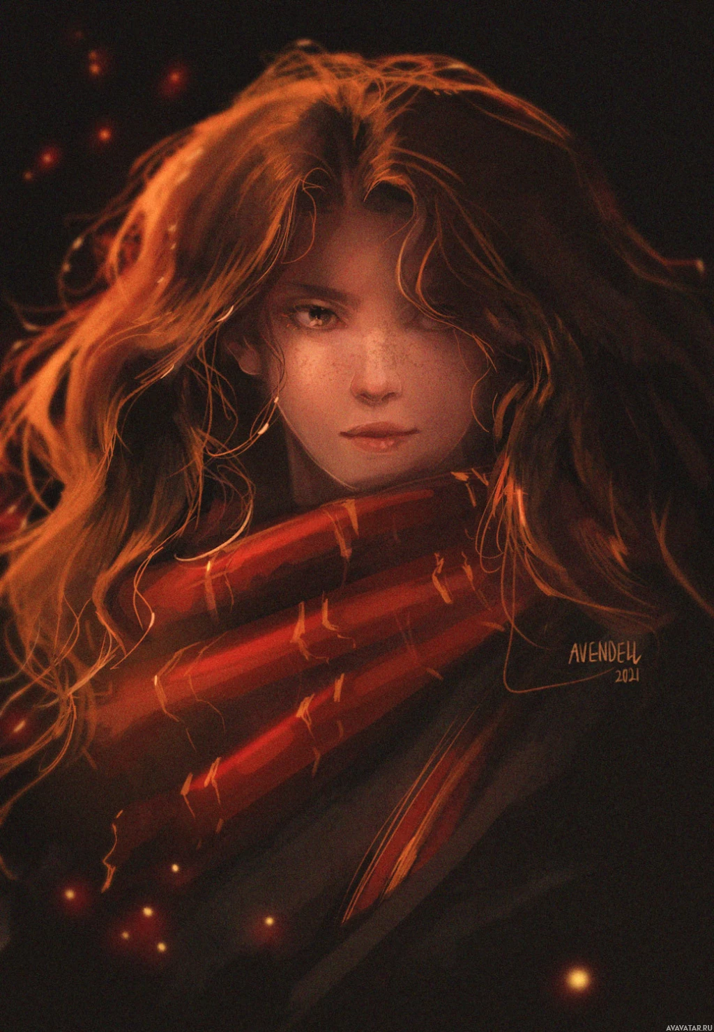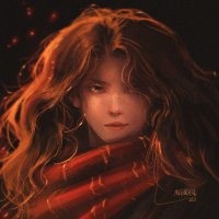 red hair and is wearing a scarf that appears to be wrapped around her neck or shoulders. Her expression is serious, and she seems to be gazing off into the distance. There are some orange or yellow elements near her head that could be interpreted as sparks or flames. The style of the artwork suggests it might be related to fantasy or mythical themes, given the character's appearance and