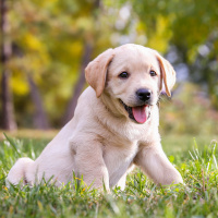 На этом снимке изображен щенок лабрадора, сидящий на траве. У собаки типичная для этой породы лохматая шерсть, и она выглядит счастливой, о чем свидетельствуют ее открытая пасть и виляющий хвост.