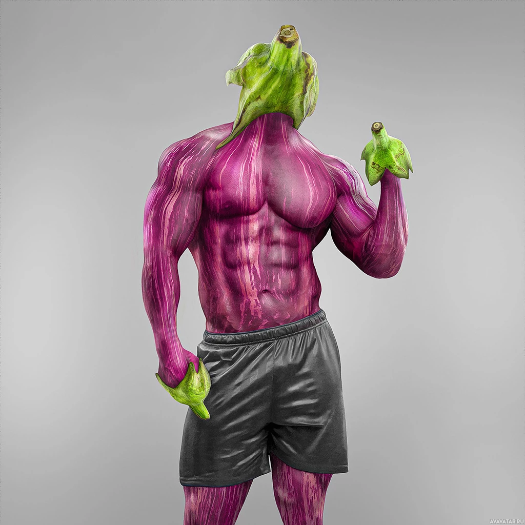 The image shows a person with a body covered in purple and pink areas, resembling the skin of a vegetable or