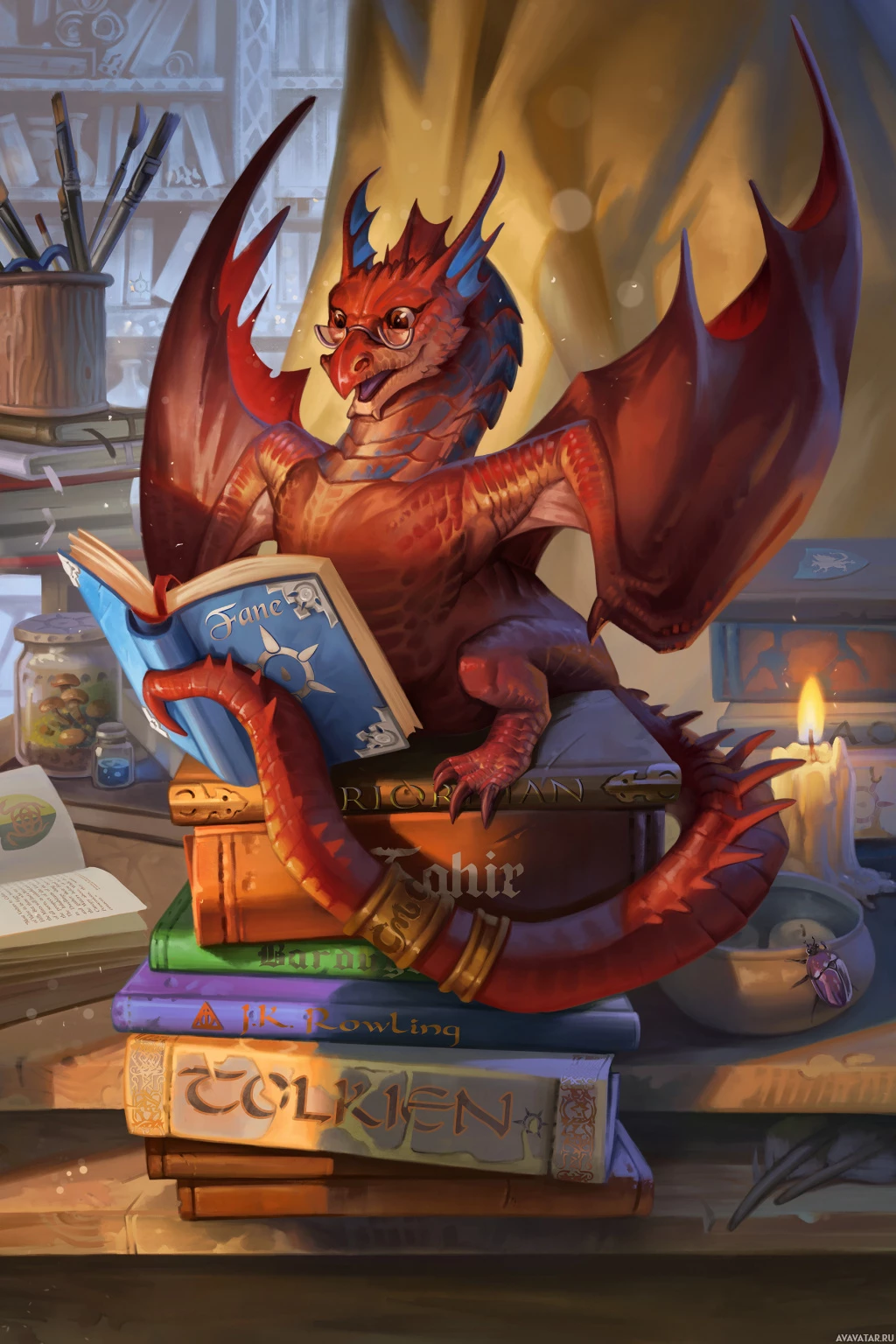 a world of fantasy where dragons can read and engage with human activities such as studying or writing.