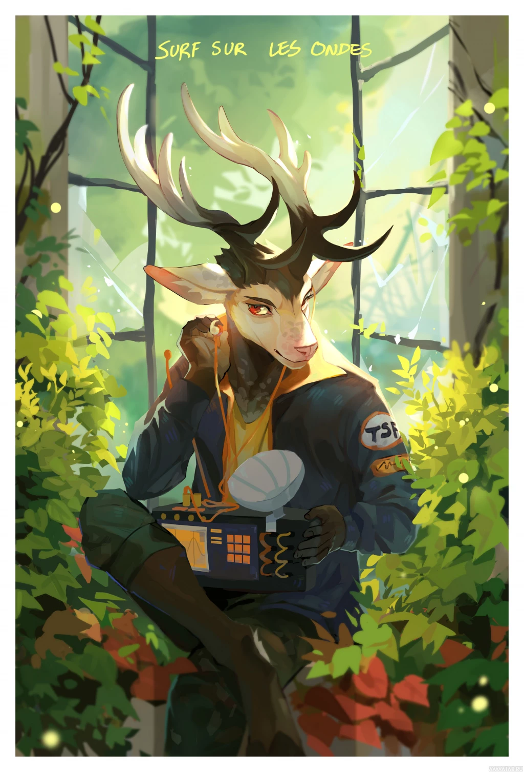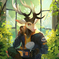 The image shows a character that appears to be a deer with human-like features. This character is wearing headphones and sitting in what looks like a jungle or