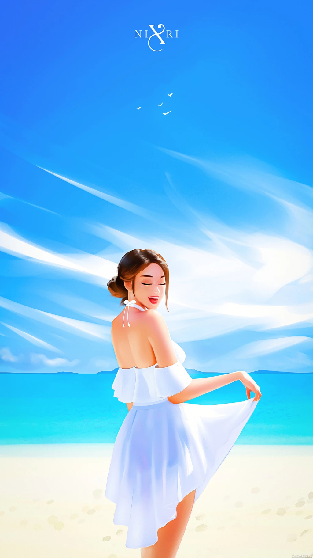 The image depicts a stylized illustration of a person standing on a beach. The character is facing away from the viewer, with their eyes closed and smiling broadly, as if they are enjoying themselves in a relaxed and carefree manner. They're wearing a white, off-the-shoulder dress that flows to the ground, suggesting
