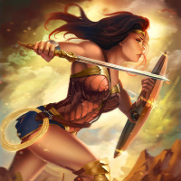 Wonder Woman typically wears armor with gold trim and a tiara on her head, which are visible in the image. The background suggests