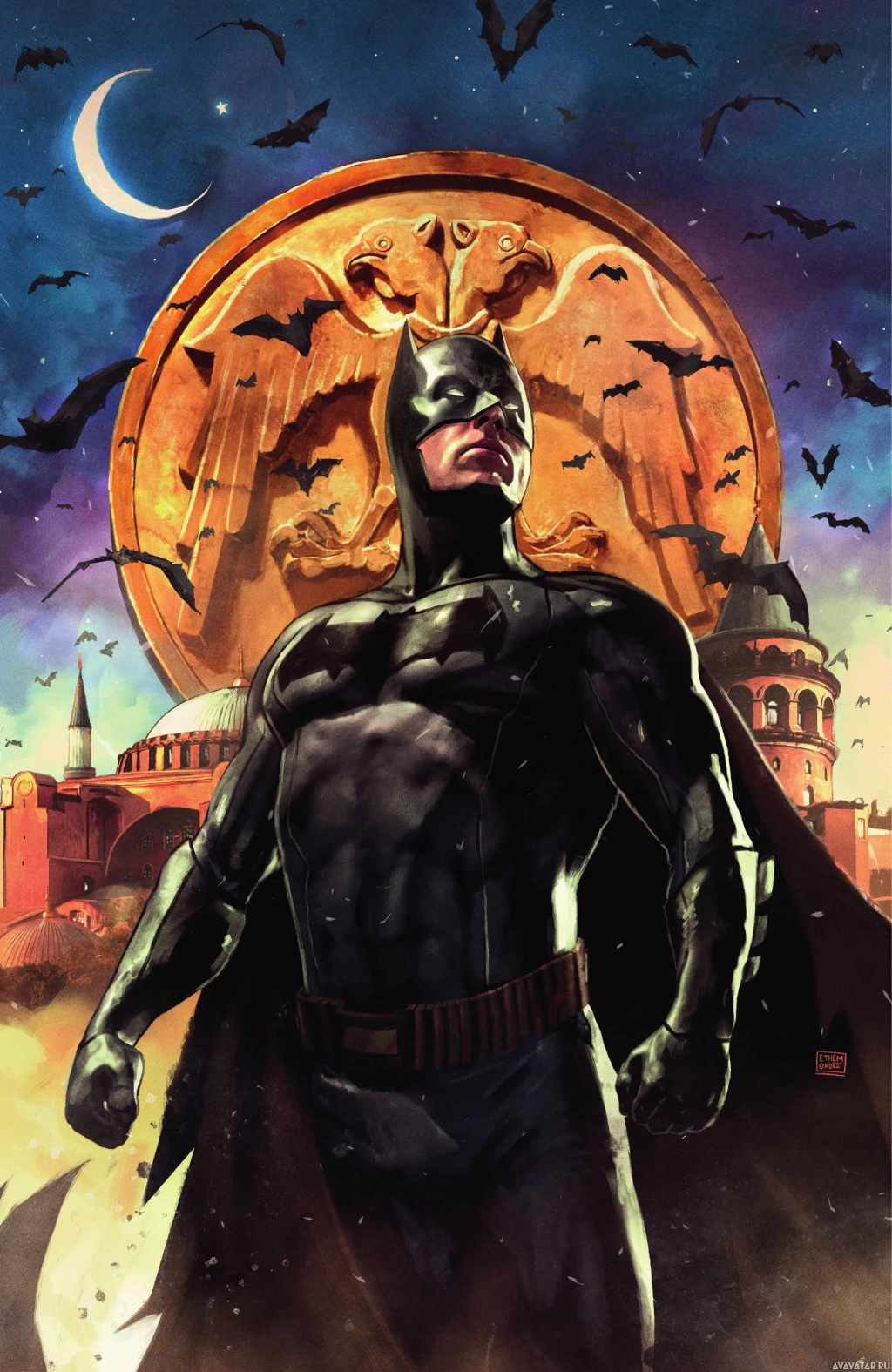 bat emblem in the background and bats flying around him. Below Batman's feet, there is