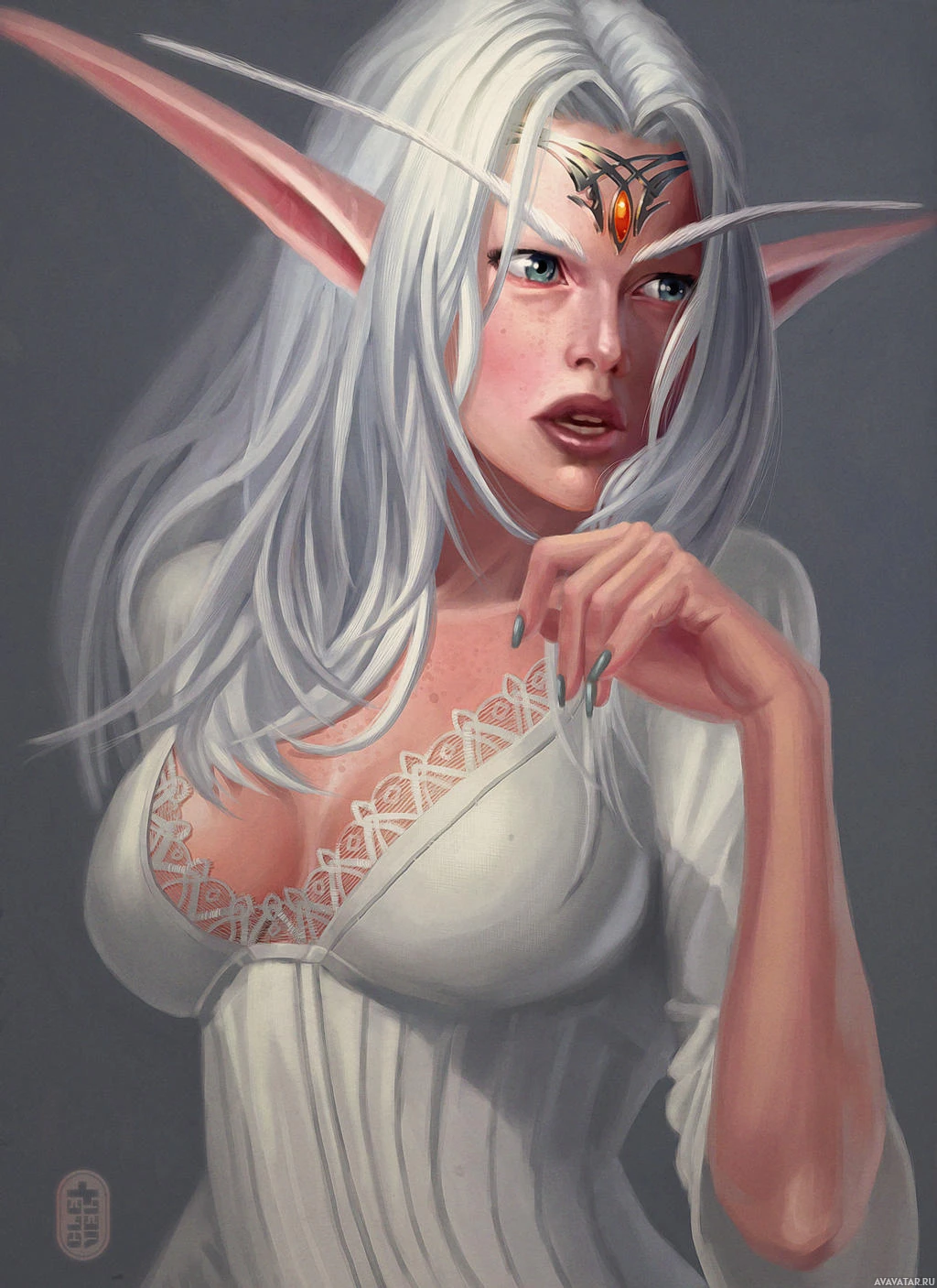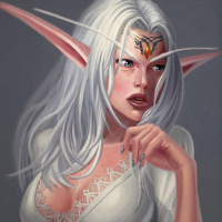 a fantasy character with white hair, resembling an elf. She has pointed ears and is wearing what appears to be a detailed and elegant outfit. Her expression seems contemplative or concerned, and she is looking off to the side. The artwork is realistic in style, suggesting that it might be part of a larger fantasy narrative or