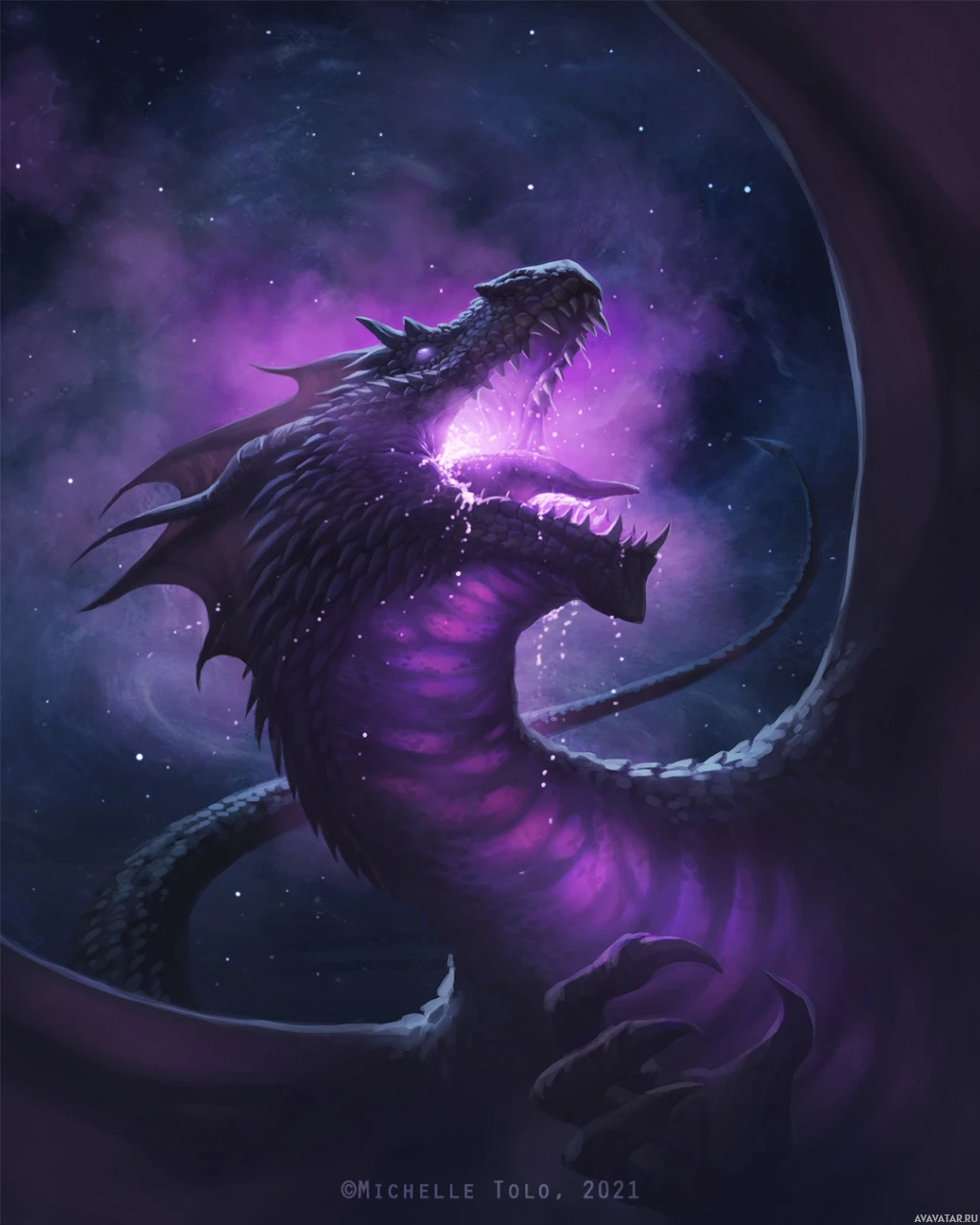a purple aura around the dragon, which enhances its mystical and fantastical appearance. The artwork is rich in color and detail, conveying