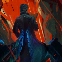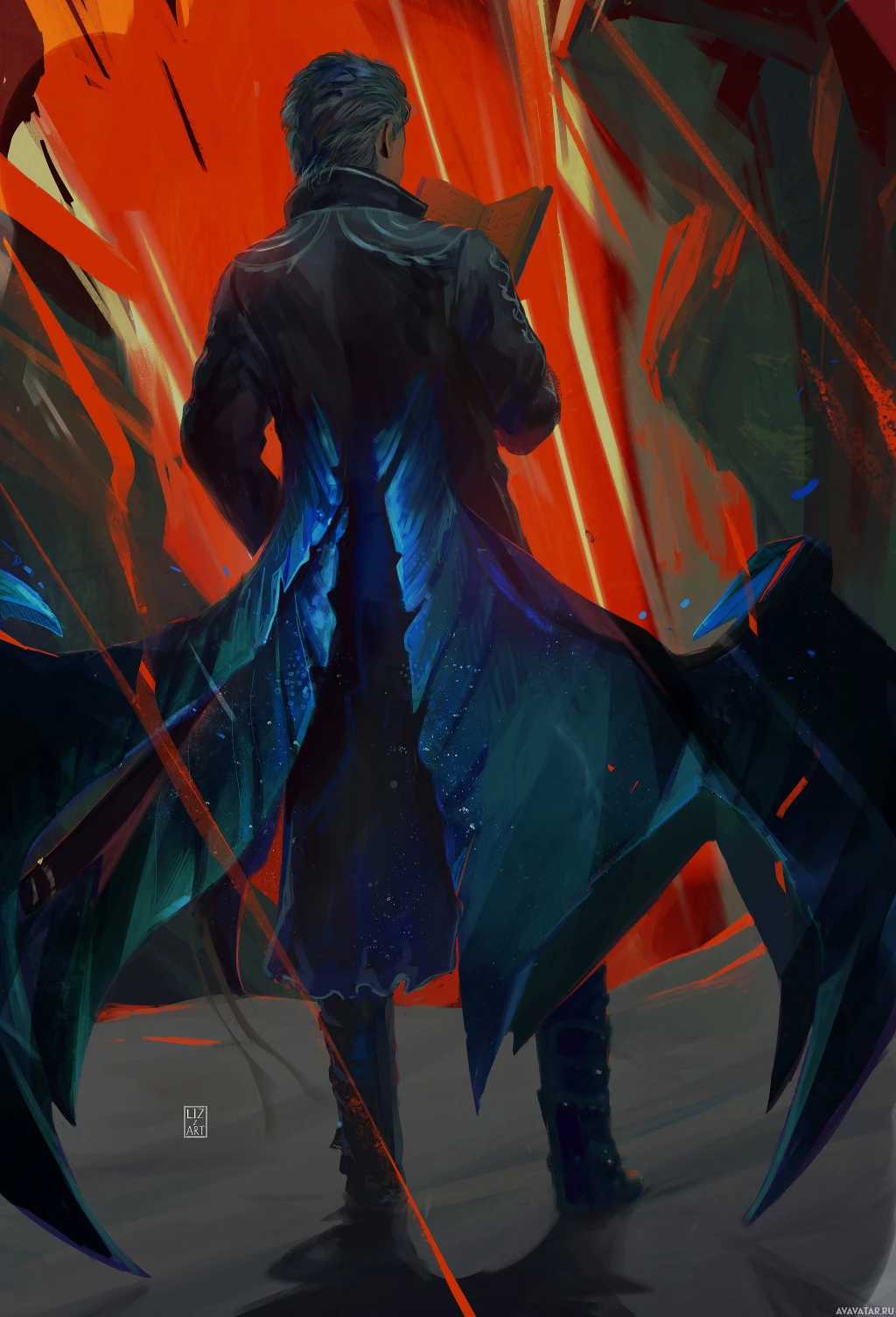 The image depicts a fantasy-style illustration of a character from behind. This individual appears to be wearing a dark coat and has wings on their back, suggesting they are an angel or a being with avian characteristics in this
