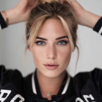 blonde hair, blue eyes, and a neutral expression on her face. She is wearing