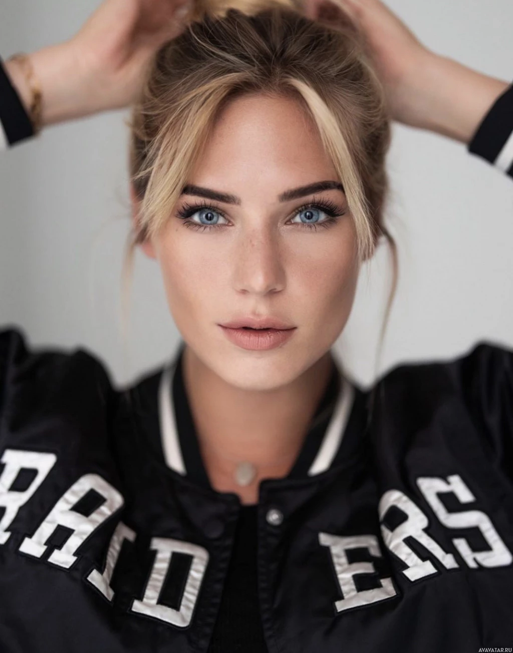 The image shows a woman with a natural and makeup-enhanced appearance, posing for the camera. She has long