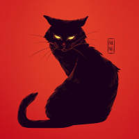 black cat with yellow eyes, sitting upright on what appears to be a red surface. The cat's fur and whiskers are detailed, giving it a somewhat anthropomorphic appearance. In the background, there is