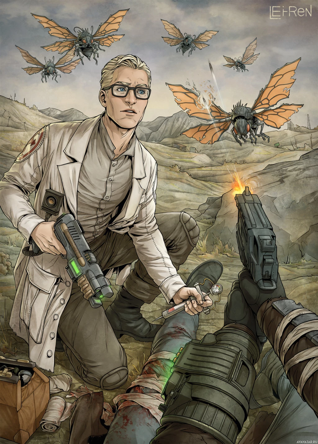 a scene of chaos with insect-like creatures flying overhead, and there are explosions visible. The character is holding a pistol and has a backpack that might contain equipment for their adventures in