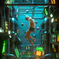 fiction setting. The character is depicted from behind, seemingly floating or suspended without gravity assistance due to their