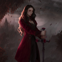 a red coat that matches the color of her hair, which seems to be long and flowing. The environment around her looks dark and somewhat ominous, possibly indicating a scene from a fantasy or