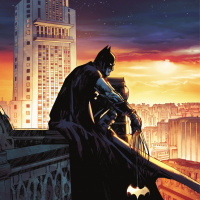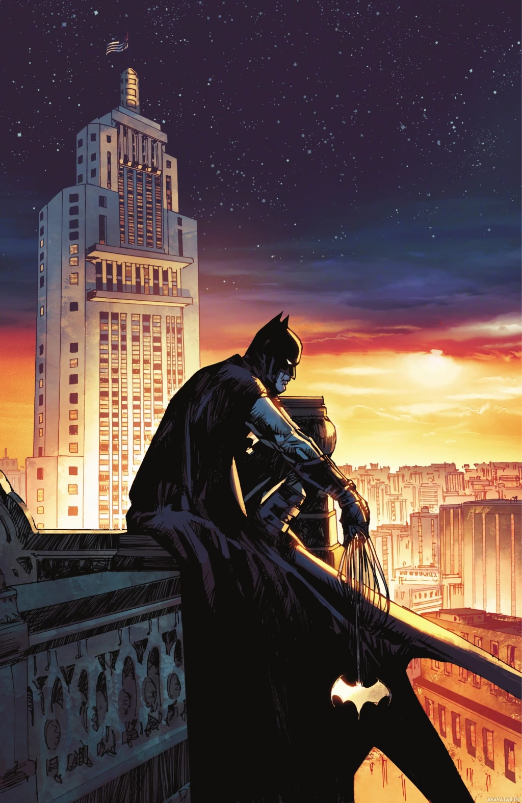 a city skyline in the background. The sky has stars and is colored with hues that suggest either dawn or dusk. Batman's cowl and cape are clearly visible, symbolizing his role as