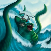 sea creature; one tentacle wraps around him while another holds what looks like an octopus toothed weapon, reminiscent of the character's iconic "Dentatus" weapon in-game. The background suggests a stormy