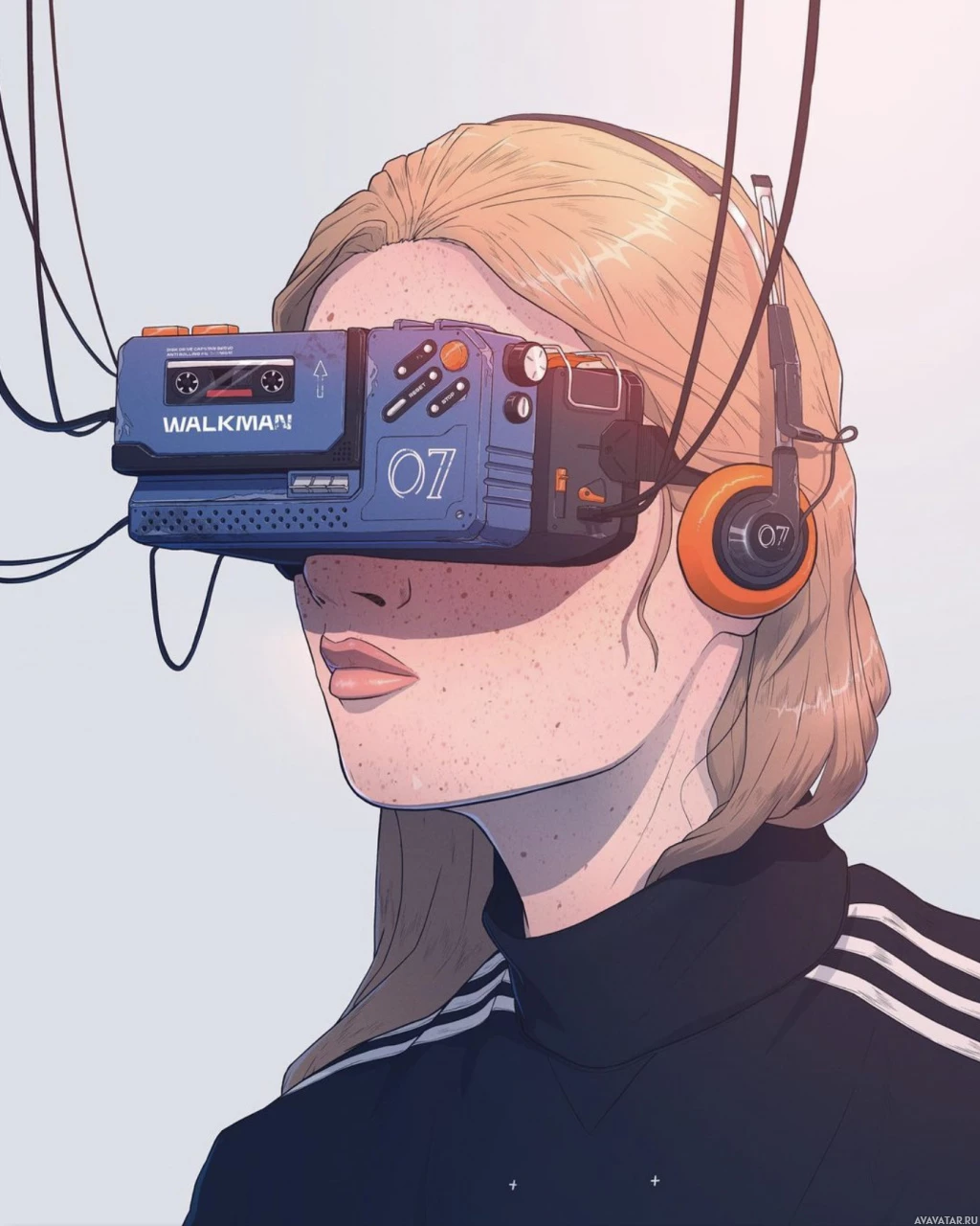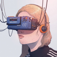 blonde hair, wearing headphones and what appears to be an advanced virtual reality (VR) system on her face. She has