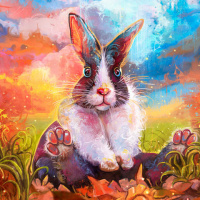 The image features a painting of a rabbit sitting in what appears to be