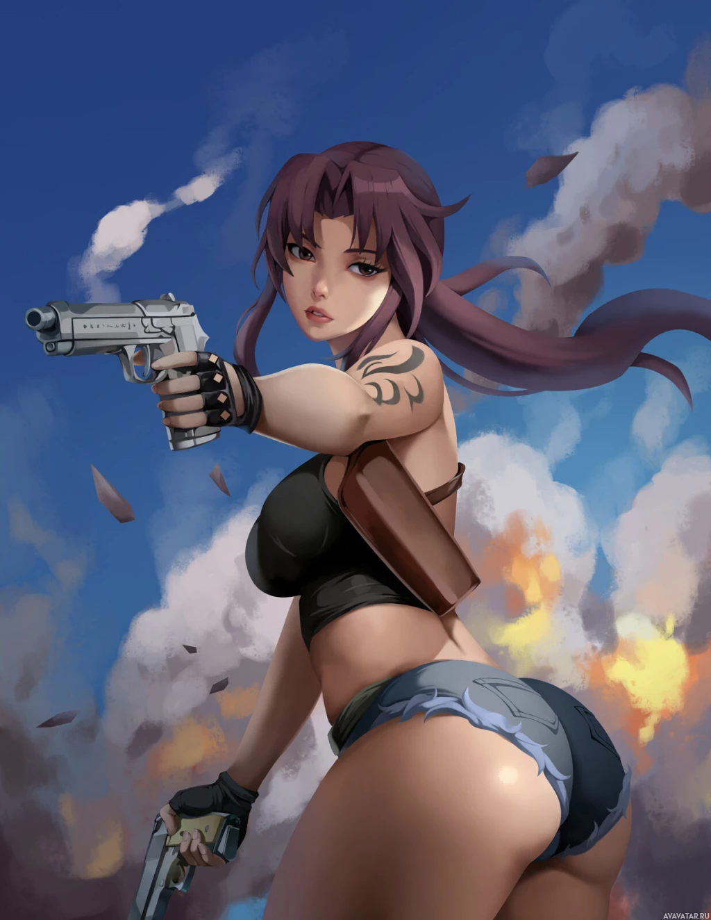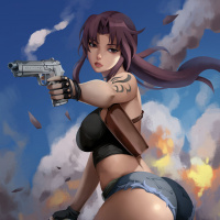 a female character with an assertive pose, holding a pistol in her hand. She has