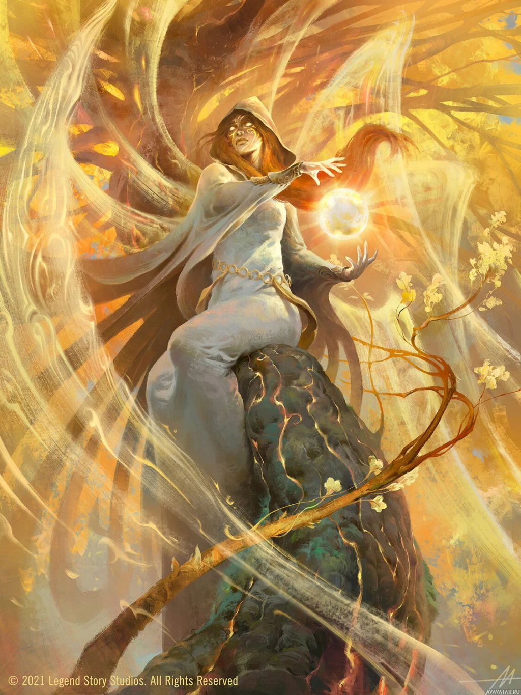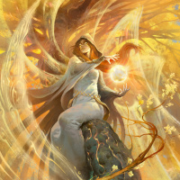 a fantasy character who appears to be casting a spell or performing some kind of magical act. The character is surrounded by an ethereal,