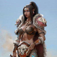 an armor piece resembling the chest of an animal (possibly a wolf), with visible fur, suggesting a connection to nature and possibly a warrior or hunter archetype. She is holding a bow and quiver full of arrows on her back. Her attire includes what appears to be leather clothing with