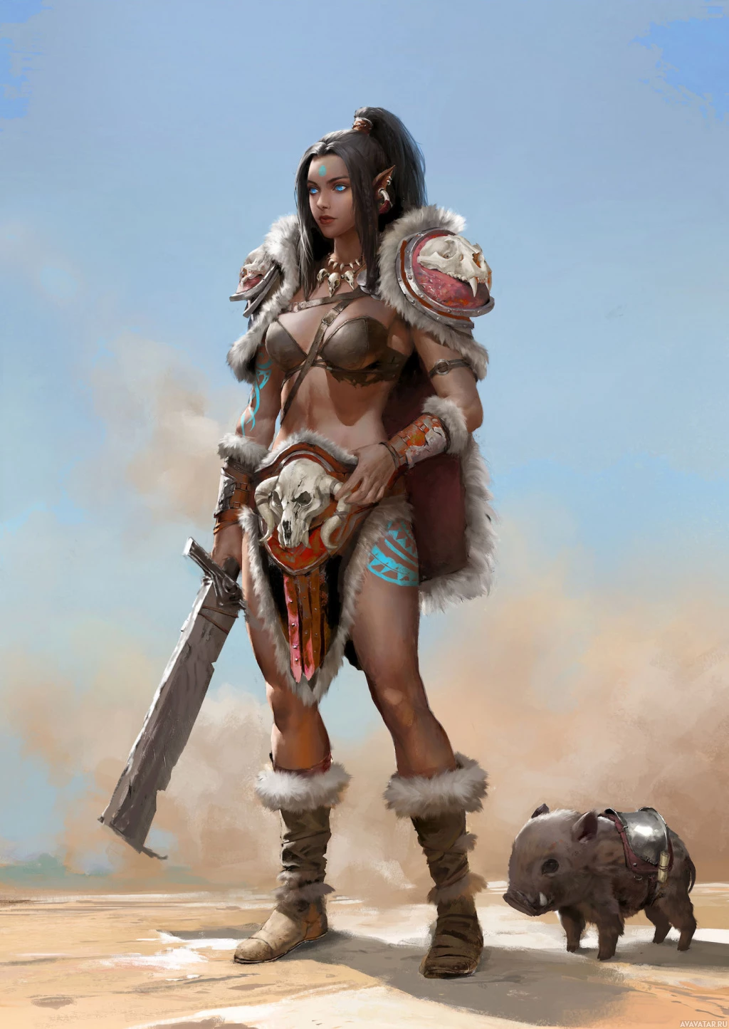 a small animal resembling a badger or similar creature at her feet. The character's pose and attire suggest she might be from a video game, comic book, or other fantasy media.