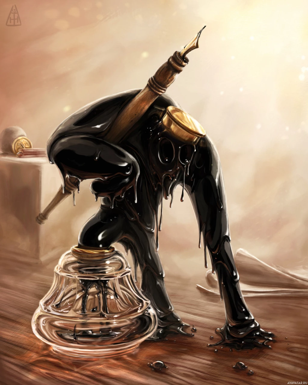 a writing desk, which is partially submerged by the same substance that's covering the character's body. There are also some items on the desk that might suggest a setting of creativity or study, such as what looks like
