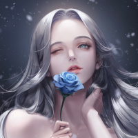 white hair and eyes that are often depicted as anime-style. She is holding a blue rose delicately to her lips, giving the impression of