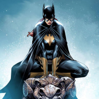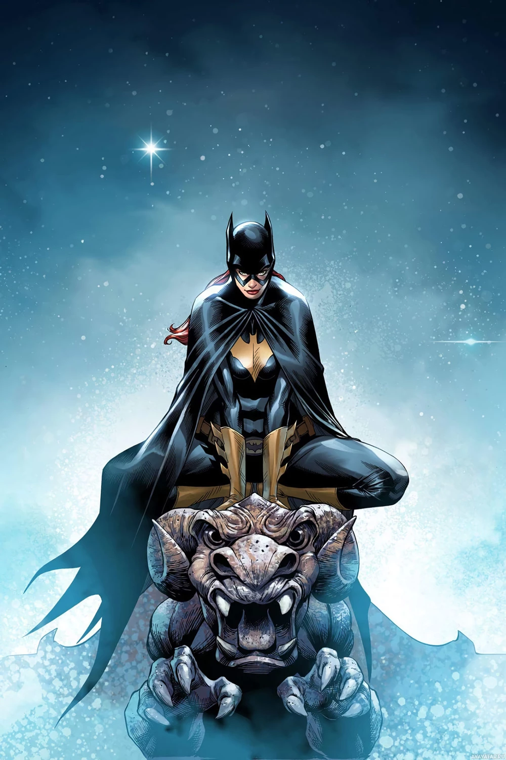 The image features a character known as Batgirl, depicted in her costume. She is sitting atop
