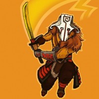 На картинке показана иллюстрация персонажа из видеоигры «Дота 2». Этот персонаж известен как Джаггернаут, и они изображены в их отличительном бронированном костюме. Джаггернаут владеет мечом и носит шлем со шлемом, который затемняет его лицо. Стиль изображения предполагает, что он может быть из наклейки или рекламного материала для игры.