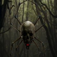 The image features a skull with the body of a spider. It appears to be a digital artwork or a creative piece that combines elements of horror and spider imagery. The background suggests a forested, possibly haunted environment.