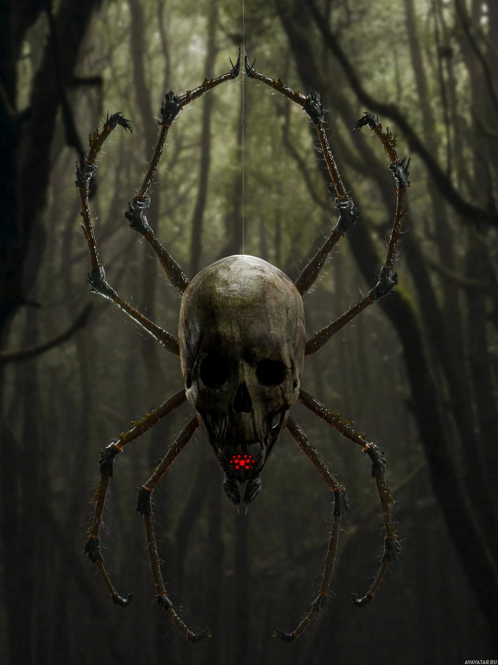 На картинке изображен череп с телом паука. Похоже, это цифровая иллюстрация или творческое произведение, в котором сочетаются элементы хоррора и изображения пауков. На заднем плане изображен лес, возможно, населенный привидениями.