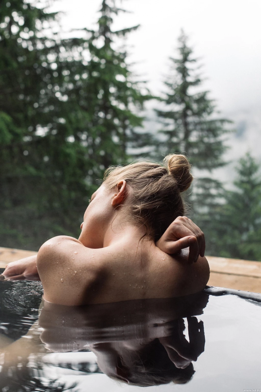 The image depicts a woman reclining in water, with her head resting on one hand while the other hand is placed behind her head. She appears to be at ease and possibly enjoying a relaxation moment. The setting seems serene, with a backdrop of