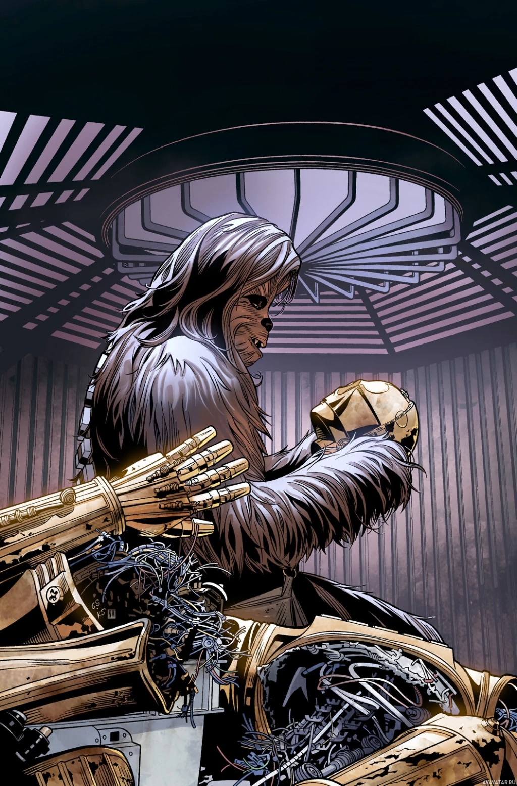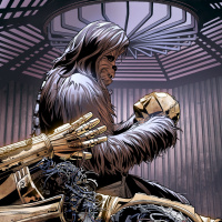 an anthropomorphic creature with long, shaggy hair sitting in front of a droid head that is part of a larger mechanical body. On the right side, partially obscured by the figures, is a robotic figure with a golden endoskeleton and black armor, resembling